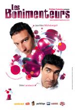 Ils étaient déjà en haut des gradins au milieu du public lorsque la lumière est revenue. Et ils ont descendu les marches jusqu’à la scène, en dansant sur une chanson italienne des années soixante-dix. Avant d'exécuter une chorégraphie tout à fait originale, à la Mya Frye, sous les applaudissements du public... Enfin, ça, c’était la seconde fois, celle où ils ont refait leur entrée, obligeant le public à leur montrer un peu plus d’enthousiasme !Formant un couple à la Lorel et Hardy, les Bonimenteurs, alias Jean-Marc Michelangeli et Didier Landucci, enchaînent les improvisations sur des thèmes imposés par le public lui-même. Car les spectateurs sont mis à contribution. Dès l’entrée, au boulot : ils ont pour tâche d’écrire sur des bouts de papiers des sujets d'impro... Le résultat est surprenant : sur scène, l'imagination des comédiens est sans borne. Les mots à coucher dehors ne leur font pas peur. De toutes façons, ils n’ont pas le choix : ils doivent improviser ! Il en faut donc de la complicité, de l’énergie et de la ressource créative pour jongler aussi facilement avec des thèmes pris au hasard !Plus qu’un simple match d’improvisation, le spectacle des Bonimenteurs est construit, au départ, selon une véritable trame : le développement de deux personnages comiques, voire clownesques. Un bon prétexte à l’improvisation, assurément. Difficile de s’ennuyer : les Bonimenteurs savent garder leur auditoire en haleine et le faire rire à tous les coups. Chapeau !