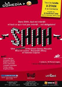 Shhh, ouais c'est le titre. Etrange, pas étrange ? Vu, déjà vu, revu ? Attendez de voir. Alors voilà, la pièce, c'est toi. Oui toi ! Toi, toi, rien que toi ! T'es là. Tu te réveilles un beau jour dans une société où parler, rire, chanter, transpirer, s'ébattre, s'ébrouer mettre une touillette dans son café se regarder, respirer, faire l'amour, bref ! Grosso modo, tous les verbes des 1er, 2e et 3e groupes... sont interdits. Ou tellement régulés que tu te dis : "Mmm... mouais... mieux vaut pas !". Une société où tout se paye. En somme, rien de très différent du monde confiné de la ligne 1 du métro.Mais. Toi qui n'attends sans doute rien du théâtre, toi qui ne viens pas voir un ami comédien, toi qui n'attends rien de particulier de cette pièce particulière, toi qui t'interroges sur la taille des pizzas surgelées par rapport à celle du carton, ouvre un peu les portes de Shhh pour y découvrir notre monde, nos couleurs et nos personnages.En bref : Shhh la première traduction française d'un jeune auteur espagnol, 1 pièce, 1 canari, 3 cookies, 3 clubs de golf, 1 escabeau, 1 chinois, 1 douce folie, 7 acteurs pour 28 personnages, fougueux, décalés, subversifs et effervescents qui ne peuvent pas dire grand-chose mais qui le disent quand même.