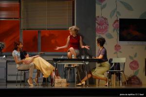 Une cuisine. Les années 1960. Quatre femmes jouent aux cartes. C’est leur après-midi préféré de la semaine, celui où elles se retrouvent entre elles, sans les maris, alors que leurs filles s’amusent ensemble à l’écart. La partie de cartes n’est que le prétexte à un moment d’intimité partagée, un moment pendant lequel elles peuvent se confier, évoquer leur vie de couple, leurs amants ou les maîtresses de leurs maris, leur conception du rôle de mère et la relation qu’elles entretiennent avec leurs enfants, bref ce qui constitue la vie d’une femme de ces années-là. Car, dans ces années 1960, même si la société commence à évoluer (que ce soit en France ou en Italie, puisque c’est en Italie que Cristina Comencini situe son intrigue), la place de la femme est encore, bien souvent, à la maison. Sa principale occupation est alors d’élever ses enfants ; d’où l’importance des discussions des quatre héroïnes sur leurs relations à leurs filles.La même cuisine, années 1990. Les quatre filles des quatre protagonistes précédentes se retrouvent trente ans plus tard, au même endroit, à l’occasion de la mort d’une des mères. Elles évoquent leurs souvenirs communs, leurs mères, mais aussi leurs maris, leurs ambitions professionnelles, leur désir plus ou moins fort d’avoir des enfants. Elles ont l’âge de leurs mères dans le tableau précédent, mais elles paraissent plus jeunes, elles n’ont pas d’enfant, elles sont plus stressées, plus affirmées, mais, finalement, pas plus heureuses. Ce que Cristina Comencini montre, c’est l’évolution du statut de la femme dans la société européenne entre les années 60 et aujourd’hui. Sur le ton de l’humour, ses héroïnes évoquent leur quotidien avec verve. Jamais la pièce ne verse dans le tragique, même si la vie réserve des désillusions à ces femmes ordinaires. C’est ce qui nous plaît dans son texte : chaque spectatrice (et peut-être chaque spectateur) peut s’identifier, reconnaître une mère, une fille ou une amie en ces femmes, être touchée, tout en riant de leurs déboires. Et Claudia Stavisky conserve cette légèreté apparente dans une mise en scène simple, qui met en relief la complicité des quatre personnages ainsi que celle des quatre comédiennes qui les interprètent. Toutes les quatre, Ana Benito, Marie-Armelle Deguy, Corinne Jaber et Luce Mouchel, sont parfaites ; leurs répliques fusent avec naturel et emportent notre adhésion tout au long de la représentation, qu’elles jouent les mères ou les filles. Voilà un "jeu double" tout à fait réussi.