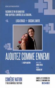 Facebook est un jeu dangereux pour qui perd le contrôle de la situation... Séréna, mariée et mère de famille, tombe sous le charme de Romain, qui n'est pourtant rien de plus qu'une photo de profil et quelques mots postés sur un mur. Le désir est trop fort, et plus rien n'existe que son envie de lui envoyer des messages et de commenter ses statuts. Jusqu'où ce jeu de la séduction ira-t-il ? Mis en scène par Camille Solal, comédienne de "On peut se prendre avec sa langue" du même auteur en 2009, ce couple de comédiens irrésistibles mènent la danse sur un texte envoûtant : sentiments exacerbés, frustrations, désirs... L'auteur Joseph Agostini s'interroge sur le phénomène de l'addiction et de la quête d'un amour impossible. Après le Festival d'Avignon, cette nouvelle création entame cet hiver une tournée parisienne ! A découvrir !