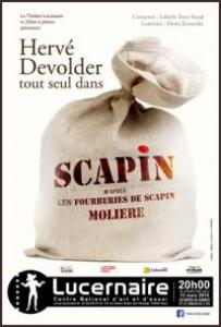 Jouer Les Fourberies de Scapin tout seul, il fallait oser ! Hervé Devolder l'a fait ! On connait son incroyable talent d'artiste grâce à Chance, Jupe courte et conséquences. Quel plaisir ce Scapin ! Hervé Devolder se retrouve seul sur scène, les autres comédiens ayant pris la poudre d'escampette pour diverses raisons. Hervé se retrouve face au public, un peu gêné au début. Et puis, il nous fait imaginer le décor de l'intrigue, les personnages et les situations. Et c'est parti pour 1h20 de performance.