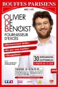 Sur les colonnes Morris, l'affiche des Bouffes Parisiens présentant Fournisseur d'excès, le dernier spectacle d'Olivier de Benoist, attire l'il sur deux indices : la jovialité de l'artiste et l'encart précisant "30 représentations exceptionnelles à partir du 13 juin".