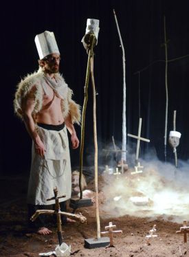 La mise en scène est puissante. La scène est recouverte de terre fraîchement battue, noire, sombre et dont l’odeur puissante envahit la salle. La terre pour l’objet des conflits, pour tout le sang qu’elle a absorbé, pour les traces qu’elle laisse sur les comédiens, comme cette guerre laisse des traces sur les hommes ; la terre organique, vivante, celle qui recouvre les corps et d’où les morts se relèvent pour raconter. Des tombes, des croix des trois religions principalement présentes sur cette terre, les chrétiens, les musulmans et les orthodoxes ; et des têtes décapitées qui fixent de leurs grands yeux écarquillés les spectateurs et le jeu de massacre qui se déroule devant eux. Le visuel est fort, tout comme le jeu des acteurs.