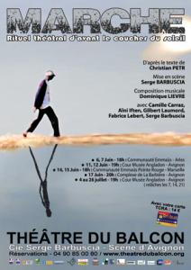 Création 2015 du Théâtre du Balcon, ce spectacle «destiné à être joué dehors, en plein air» a pour point de départ un texte de Christian Petr élaboré à partir d'un événement vu, sinon vécu, par son auteur. Au printemps 2000, il a pu voir de chez lui un homme, âgé d'une quarantaine d'années, avec pour seul bagage un sac de couchage, arrivant place des Corps Saints à Avignon. Six ans, il va vivre sur cette place, se battre avec les poubelles, se tapir sous les porches, se reposer contre les façades. Jamais il ne dira un mot... Car celui qui marche ici n'a plus de but, plus de sens, plus d'existence presque. Observé par l'auteur depuis sa fenêtre, des mois durant, il compte ses pas, six foulées, s'arrête, repart, six foulées... dans une errance sans issue et désespérée...