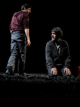 Sur une estrade recouverte d’une végétation qui empêtre les protagonistes : une table et quelques chaises en formica (allusion aux années 50 ?), un réfrigérateur bancal (comme cette famille ?). Sur le fond de la scène : des écrans lumineux où tombe la neige (allusion au froid qui règne dans les relations parents-enfants ?). En marge, juste devant le public, un micro : le fils, l’absent, vient y prononcer quelques mots, une sorte de slam, sur une mélodie qui s’élève entre les scènes dialoguées. De l’ensemble se dégage une atmosphère de modernité ; la mise en scène, qui allie différents arts, est vraiment dans l’air du temps.