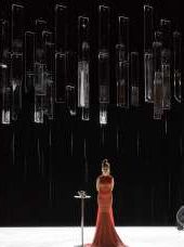 Le passage du temps est non pas symbolisé mais concrétisé par les pans de glace qui au fur et à mesure de le représentation tombent en s’effondrant avec fracas autour de la femme. Arrogante, insoumise, encore coquette, maniant avec brio l’autodérision et le sarcasme, avant de se laisser entamer puis envahir par la panique que scande le son répété d’une cloche, pour petit à petit devenir pitoyable, pathétique, et enfin rompue, défaite à la fin de la pièce quand le lustre tout entier s’écroule à ses pieds… Nous entrons à reculons, mais nous entrons, avec Natalie Dessay dans « ces zones troubles » qu’invente pour nous l’auteur et qu’elle fait vibrer, jusqu’au vertige, dans ces zones obscures de notre imaginaire personnel et collectif.