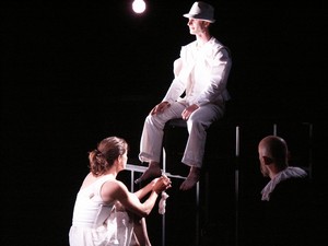 Le père sur un dos supporté entre sur le bord de scène devant un public qui ne demanderait, à en croire la mise en scène, qu’à être éclairé.Tout ce qui est détestable dans le théâtre classique et rebute la jeune génération allergique aux récitations, lectures, déclamations et autres gnangnantises est ici réuni. Les vers cornéliens chantent haut dessus les oreilles du public imperméable, entrecoupées de traductions des termes désuets en langage d’aujourd’hui par un élève comédien fayot : ainsi "illusion comique" signifie-t-elle "illusion théâtrale", "poulet" "billet doux" etc, etc, etc.Malgré l’énervement que ses interventions suscitent, il a le mérite de donner du sens à ce qu’il dit et de se faire remarquer et entendre... Ce début est totalement indigeste, et aggravé par un bruit de fond rappelant vaguement le raclement d’un tuyau ou le tangage d’un mât.Evidemment, ce sketch ne peut pas durer et l’informatique prend le relais du malheureux bon élève qui ne fait pas l’unanimité parmi le public. L’épreuve doit être au moins aussi terrible pour les comédiens que pour les spectateurs, car ils voient en pleine lumière les visages déconfits des spectateurs effrayés à l’idée d’endurer 2 h 30 de ce régime indigeste. Comme prévu, le rideau tombe enfin sur cette loufoquerie et la scène apparaît surmontée d’étagères vides où végètent des comédiens poussiéreux. Etabli, salle de répétition ou arrière boutique d’un magasin de chaussures ?Le père désespéré assiste alors à une répétition de théâtre assez déplorable : certains des comédiens, notamment Matamore, ayant les plus grandes difficultés à déchiffrer leur texte sur le prompteur. Malgré quelques bonnes idées, la mise en scène reste très très tirée par les cheveux, forcée et pas du tout évidente. Montrer l’envers d’une pièce assez compliquée qui parle de la difficulté d’être comédien devrait certes aider à en comprendre le sens. Mais forcer le spectateur à mettre son nez dans toutes les coutures risque de ne lui faire voir que les nuds et de le décourager assez vite. C’est exactement ce qui se produit ici, surtout que la pièce dure, dure et dure et les comédiens (les vrais de vrais) bafouillent beaucoup (hors des effets voulus). La seconde partie rattrape un peu mais le final, où les comédiens se présentent au public, achève de classer cette œuvre dans la catégorie des travaux d’écoles.Difficile de prendre position : peut-être est-ce génial, peut-être est-ce raté, peut-être est-ce une illusion ? Face à tant d’options, mieux vaut qualifier ce spectacle d’expérimental.