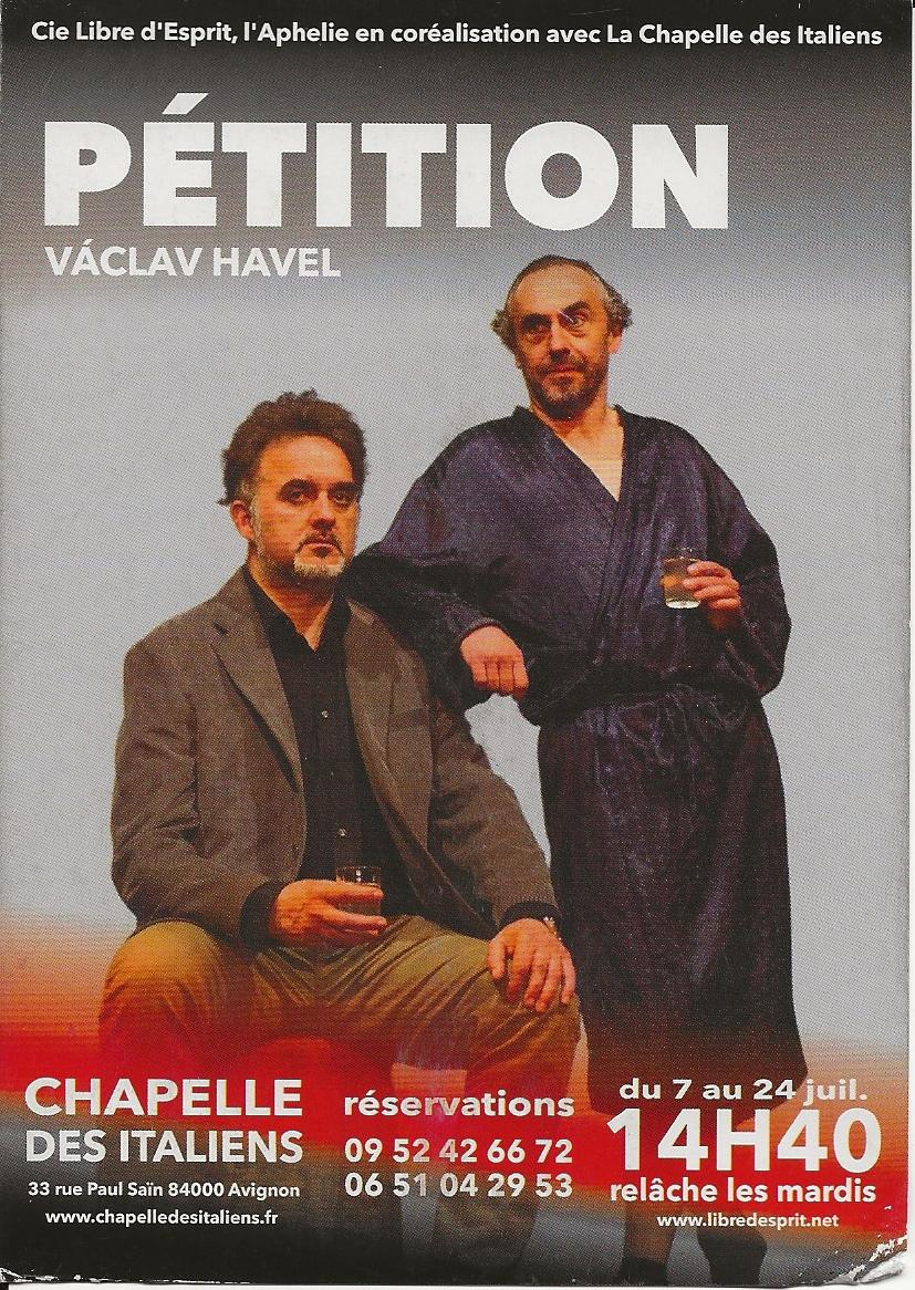 3ème volet de Vaclav Havel. Avec toujours Ferdinand, mais là, il est invité par une ancienne connaissance pour qu'il écrive une pétition afin de de libérer un chansonnier. Ce chansonnier père de l'enfant que porte la fille de l'ancienne connaissance ! Et miracle, notre Ferdinand avait déjà écrit la pétition. Maintenant faut que ce Monsieur (artiste connu) signe la pétition.