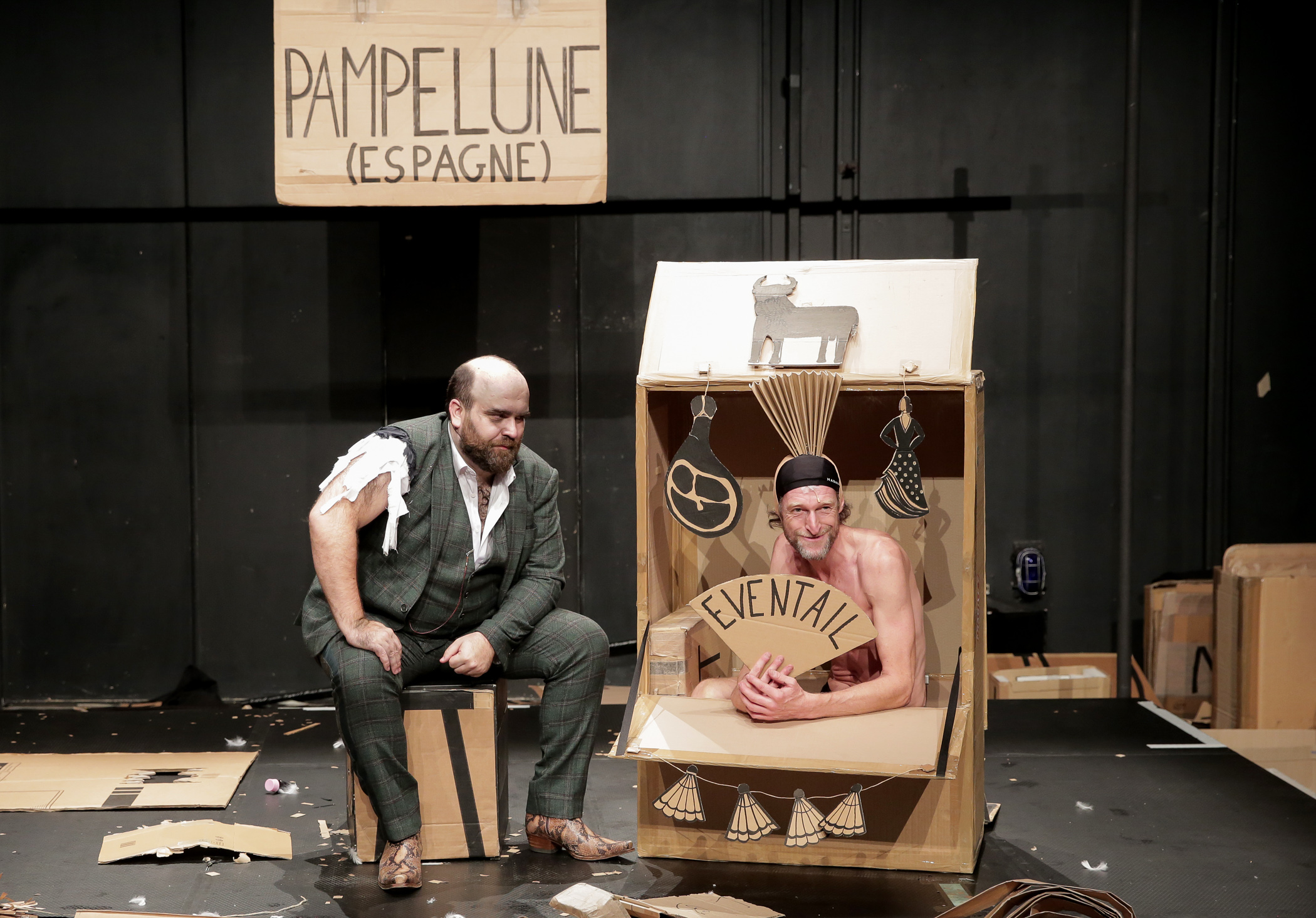 Ajoutons à cela, une grande inventivité dans l’utilisation des cartons pour créer costumes, accessoires et décors, ainsi que quelques clins d’œil à chaque pays, dont les clichés sont ravivés sous nos yeux, et l’on obtient une comédie réjouissante. A chaque nouveau tableau, on attend de voir les bonnes trouvailles des metteurs en scène : deux petits cartons un peu profonds, et voilà une paire de bottes de pluie pour affronter la traversée de l’Ecosse ; un grand carton plat qui s’ouvre en deux, et voilà l’échoppe d’un commerçant espagnol où acheter un beau jambon ; deux ou trois cartons bricolés ensemble et c’est un vélo qui va transporter notre voyageur immobile. Tout cela prend vie sous nos yeux ahuris ; ce vaste bric-à-brac de cartons est déplacé, empilé, jeté, déchiré, transformé pour notre plus grand plaisir. Conclusion : on peut voyager à moindre coût, que ce soit en allant au théâtre ou en s’inventant des histoires, bricolées avec les moyens du bord. Une belle leçon de création.