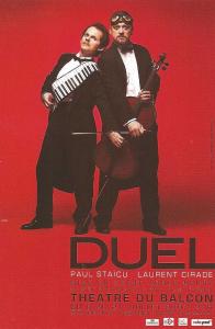 Vous cherchez l'originalité ? Foncez assister à Duel. Ce spectacle, à mille lieues de ce que l'on a l'habitude de voir, fait figure d'OVNI théâtral. La recette est inédite : prenez un contrebassiste un peu fou (Laurent Cirade), accompagnez-le d'un pianiste un brin déjanté (Paul Staïcu), et préparez-vous à une véritable explosion musicale à vous faire péter les tympans !Duel est un règlement de compte tout en musique, une sorte de délire sonore et visuel absolument génial. Au-delà de la maîtrise parfaite de leur art respectif, nos deux compères dégagent une énergie du tonnerre. Ils jouent debout, assis, couchés, rien ne les arrête. Le spectateur assiste à cette joute musicale et humoristique où le classique se mêle aux morceaux les plus contemporains sans la moindre anicroche. Même les célèbres génériques de science-fiction répondent à l'appel : les adaptations audacieuses de Rencontre du troisième type, d'ET et de Star Treck au piano et à la contrebasse valent assurément le coup d'il... D'oreille plutôt ! Bref, du grand spectacle. Chapeau messieurs !