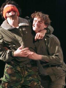 Durant la guerre d’Ex-Yougoslavie, une famille subit peu à peu les outrages et la violence de la guerre jusque dans son sein. L’aîné des fils, enrôlé de force dans la milice serbe, doit abandonner sa promise à sa famille et déserter pour l’Europe. Son jeune frère, rêvant de devenir un héros de guerre, se laisse entraîner par son ami, fou de guerre. On assiste à la déchéance de cette famille qui se retrouve malgré tout, chaque soir, avec pour seule nourriture, un potage insipide et "le diable en partage". Alors, Sladjana, la mère, tricote pour boucher les trous, raccommoder la famille et panser les plaies, tandis que Vid, le père, écrit en silence dans son petit carnet "comment c’était avant", pour qu’on n'oublie rien. Il n’est nul besoin de montrer les champs de batailles pour réaliser l’horreur de la guerre. Fabrice Melquiot nous fait ressentir la guerre à travers le petit trou de la lorgnette que constitue cette famille déchirée.La compagnie HoCemo, ce qui signifie en serbe "On y va", ne ménage pas sa peine pour nous traduire la puissance dévastatrice du Diable en partage. Tantôt caressés par les chants cristallins de la jeune Elma, puis la seconde d’après giflés par les colères de Jovan, nous sommes déstabilisés par le jeu des comédiens. Certaines répliques nous balancent entre le rire et l’angoisse. Le second degré caustique de Melquiot nous fait souvent culpabiliser de rire de l’énormité de l’horreur, à la manière parfois du film C’est arrivé près de chez vous, comme la guerre en Bosnie, à deux heures d’avion de la France. Cependant, nous happons goulûment chaque scène comique de la pièce comme d’éparses bouffées d’oxygène que nous insufflerait "le bon Dieu en échange". Cette pièce puissante s’adresse aux amateurs de vérités, capables de recevoir le pire et parfois le meilleur de la vie. C’est un incontournable du cru 2008 d’Avignon.