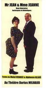 Monsieur Jean et Madame Jeanne est un spectacle qui propose deux univers absurdes et grotesques, comme les morceaux d'un miroir brisé reflétant l'âme humaine. Chacun le dit à sa façon : Madame Jeanne est une explosion anarchique, elle déborde tant dans son physique que dans l'espace. Monsieur Jean, personnage étriqué, enfermé dans son costume et dans l'espace de jeu, cherche désespérément une issue. Pour Madame Jeanne, les textes sont de Alphonse Allais et pour Monsieur Jean de Matei Visniec.