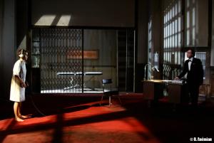 Acte de Lars Norén est le deuxième volet d’une trilogie sur la mort. C’est une pièce très forte, mettant en présence un homme et une femme, lui médecin, elle terroriste incarcérée, dans un huis clos extrêmement tendu. Si le contexte spatio-temporel n’est pas complètement élucidé, on devine l’Allemagne des années 1970 ; l’héroïne s’apparente à un membre de la bande à Baader, même si cette dernière n’est jamais citée ; quant au médecin, il représente l’ordre en place, guère plus humain que les terroristes, vu la torture qu’il inflige à ses prisonniers. Norén met l’accent sur les conditions de vie inhumaines des détenus politiques de cette époque. Les révolutionnaires gauchistes de ces années 1970 ont, en effet, été emprisonnés dans des cellules isolées les unes des autres, coupées de tout bruit et exposées en continu à une lumière blanche aveuglante ; de telles conditions, contre lesquelles Sartre, par exemple, s’est insurgé après avoir rencontré Baader, entraînent des dégradations physiques et psychiques inéluctables chez l’être humain.Le début d’Acte nous montre d’ailleurs la fragilité de la détenue, qui tente de rester digne et de s’opposer au médecin qui doit l’examiner, mais qui laisse paraître son affaiblissement et ses troubles au fur et à mesure de la confrontation. Cette femme est à la fois bourreau, car ancienne terroriste et rebelle à l’autorité (représentée ici par le médecin, qu’elle questionne et essaie de mettre mal à l’aise), et victime du système carcéral et du médecin lui-même, dont le rôle évolue au cours de l’entretien. Acte, c’est effectivement l’histoire d’un affrontement entre deux êtres que tout oppose, dont les rôles semblent prédéterminés, mais qui, en réalité, vont exploser en cours de route jusqu’à s’inverser. Les masques tombant au fil de la conversation, le plus fou n’est finalement pas celui que l’on aurait cru. Dans un climat d’une tension extrême, très bien rendue par le décor, une pièce délabrée à l’éclairage froid, et par la musique stridente qui s’élève par instants, les comédiens interprètent admirablement leurs personnages. La subtilité et l’intensité de leur jeu nous captivent du début à la fin. On passe une heure à retenir son souffle et à admirer l’expressivité du regard blessé d’Hélène Viviès et l’inquiétante bonhomie de Vincent Garanger. Tous les deux sont précis et justes. C’est là la première qualité du spectacle. Outre une scénographie parfaite pour rentre l’atmosphère pesante de la rencontre, leur présence s’impose, forte et émouvante. On ressort véritablement touché, bousculé par ce spectacle, dont le texte soulève bien des questions existentielles, mises en relief par la pertinence de la mise en scène.