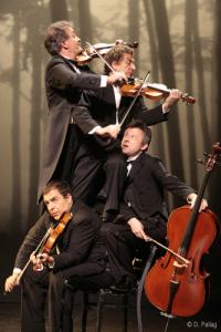 Est-il encore nécessaire de vous présenter le Quatuor ? Le groupe, né en 1980, est aujourd’hui mondialement connu : il a obtenu le prix du meilleur spectacle off à Avignon en 1982, avec De Vivaldi au Rock’n Roll, et, depuis, n’a cessé de parcourir le monde pour donner des représentations de ce spectacle, ainsi que des suivants : Violons dingues, Le Diable aux cordes, Il pleut des cordes, Sur la corde Rêve et, maintenant, Corps à cordes. Les membres du Quatuor, largement plébiscités de l’Asie aux Etats-Unis, se sont même vu attribuer le titre de Chevaliers des Arts et Lettres en 2005. Doit-on vous en dire plus ou est-ce que ce "palmarès" vous convainc à lui seul d’aller découvrir leur dernier spectacle ?Pour les plus curieux, pour ceux qui, quoi qu’il arrive, préfèrent toujours se documenter un peu plus sur ce qu’on leur propose avant de réserver les places, quelques mots de Corps à cordes. Créé à Paris en 2006 et déjà bien rôdé, ce show fonctionne à merveille ; il va crescendo et happe son public par paliers. Chaque "sketch" (car on peut nommer ainsi les tableaux musicaux qui se succèdent) possède sa tonalité et son atmosphère ; l’ensemble est savamment organisé afin d’obtenir l’attention et l’adhésion des spectateurs tout au long de la représentation et de manière de plus en plus interactive. Ainsi passe-t-on d’un tableau mélodieux et poétique (avec une superbe toile de fond représentant une forêt par différentes lumières) à des moments plus vifs, regroupant différents genres musicaux et des passages joués, humoristiques pour la plupart. Les cours de chants, d’instruments et les chaises musicales sont autant de sketchs burlesques, qui ne manquent jamais leur effet comique tant les quatre interprètes maîtrisent la pantomime.Car les spectacles du Quatuor, c’est cela : un mélange subtilement dosé de musique (à cordes bien sûr !), de chant, de mime et de théâtre. Pas de lien direct entre les sketchs, mais des thèmes fédérateurs et l’omniprésence des instruments à cordes. Dans ce domaine, Jean-Claude Camors (violon), Laurent Vercambre (violon), Pierre Ganem (alto) et Jean-Yves Lacombe (violoncelle) sont des virtuoses. Ils interprètent aussi bien des morceaux classiques, attendus (des Suites pour violoncelle de Bach aux Quatre saisons de Vivaldi) que des tubes de variété des années 1950 à nos jours. Et, croyez-nous, Thriller de Michael Jackson au violon, c’est quelque chose ! Leur spectacle est, à cette image, plein d’inventivité et de décalages burlesques. Ils nous surprennent durant 1h45, déjouant sans cesse nos attentes... Alléluia ! (... à la guitare électrique, non !!)