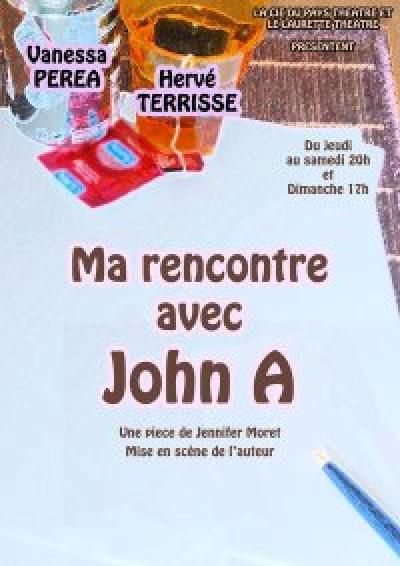 Ma rencontre avec John A est, comme son nom l’indique, l’histoire d’une rencontre, celle de John et de Lindsay. Lindsay, jeune comédienne, enchaîne des petits boulots d’hôtesse d’accueil. Désireuse de faire carrière, elle décide de contacter par l’intermédiaire d’une lettre, John A. John A, un comédien et producteur influent dans la profession, touché par la plume de cette jeune femme, la rencontre, avec l’arrière pensée d’utiliser le fameux système de la "promotion canapé" pour arriver à ses fins : c’est-à-dire... "le cul... le cul... et le cul !".Mais voilà... Chacun reste fixé sur ses propres objectifs. Tout un programme en vu... Puisque c’est là que toute la drôlerie et l’intérêt du texte de Jennifer Moret apparaît. Les maladresses et les malentendus que l’on peut vivre lors des premières rencontres, s’enchaînent sur fond de musique pop rock et de variété française.Les comédiens, Vanessa Perea et Hervé Terrisse, sont excellents. Deux natures comiques évidentes. Ils sont à la fois généreux, précis et émouvants. Bref, une comédie moderne simple, bien vue, bien faîte et bien rythmée, parsemée d’une pointe d’émotion qu'on vous recommande fortement, histoire de passer une excellente soirée.