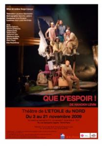 A qui nous confronte et combien avec force et picturalité ! Serge Lipszyck pour servir cette série de pièces courtes écrites par le très pessimiste Hanokh Levin, réunies sous le titre d’un humour aussi noir que la vision de Goya de l’humanité, Que d'espoir ? A nous-mêmes, possibles survivants de Babel, accrochés en grappes à l’édifice en ruine ? A nous éventuels naufragés d’un radeau de la Méduse, figures noires d’humains descendues des fresques de la coupole de San Antonio de la Florida ? Et pour quel espoir ? Pour aucun espoir, semble-t-il, vu la ténacité des hommes à se faire la guerre. Guerres des Six jours, du Liban, du Kippour et tant d’autres, parfois éclairs, s’inscrivant pourtant dans une durée sans fin, faisant naître ces textes éclairs chargés, tout autant qu’elles, de l’effroyable constat du cannibalisme des hommes et des Pouvoirs. Sidération inchangée en nos âmes confrontées à leur brutalité crue, leurs relents d’erreurs, de violences funestes, de mort réelle ou promise. Le Colosse, Saturne dévorant ses enfants ou la longue histoire des Désastres de la guerre, A tort ou à raison, Tant et plus ! Barbares, Le Vautour carnivore...1968, Toi, moi et la prochaine guerre. 1969, Ketchup. 1970, Reine de la salle de bain. 1986... Que stigmatisent, sinon ce primat du Mal dans les relations humaines, ces remarquables et étonnants comédiens devenus marionnettes et pantins, humains rampants et crépusculaires, monstre ou reine femelle démesurée, géante effrayante et dévorante, brute épaisse ou mirage d’enfant nostalgique du bonheur ? Poids dans la balance du vivre mal quelques complaintes sans musiques fragiles et pathétiques ? Sur fond d’apocalypse ou de fin du monde, rappelant aussi bien l’état d’hécatombe et de catacombes du Berlin, année zéro de Rossellini que l’univers défait de Tarkovski, notamment dans Le Sacrifice, que portent comme parole, sur ce grand manège placé dans un cercle fermé, en rotation à l’infini sur lui-même et mû par un personnage à vélo à la Beckett, ces hommes-là ? De la condition misérable de l’homme voué à remplir son temps d’existence non de projet lumineux et glorieux mais d’insignifiance, d’absurde, de folie. Pas de paix. Juste la garantie annoncée de devoir payer ou faire payer le prix fort en souffrances et en sang.Atteint fatalement par un cancer, victime et témoin de l’ignominie de la Shoa, des luttes infernales du vingtième siècle dans toutes les parties du monde, l’Europe, le Moyen-Orient et ailleurs, pandémies éternelles, Hanokh Levin, choniqueur de la vie des hommes et des pouvoirs petits, donc dangereux, contestataire incompressible, dramaturge cinglant, laisse en héritage l’image de son extrême sensibilité d’écorché. Admirable capacité de répondre au pire par l’art de construire des tableaux dignes de la haute peinture de l’Homme dans ses errances et ses incohérences, et le rire et les mots pour levier de la dénonciation, ressource vitale pour continuer de conserver ses forces, vivre, aimer. Malgré tout...Face à une atmosphère qui assomme et aux questions majeures posées dans cette uvre, combien de talent faut-il pour parvenir à mettre en scène un tel texte avec ampleur, rythme et justesse sans décompression pour le public ! Défi hautement relevé et gagné par Serge Lipzyck dont la culture notamment picturale s’impose avec évidence. Orchestrateur inspiré des lumières dans cette belle et vaste salle qui offre le plateau comme un très grand tableau, avec, procédé en abîme, des tableaux dans le tableau et des tableaux dans les tableaux. Sens de l’architecture, du clin d’il et de l’humour. Maître d’uvre éclairé d’une uvre difficile mais forte, capable de faire naître chez ses comédiens, parfaitement accordés les uns aux autres et à l’esprit du texte, l’art de la jubilation, de la dérision, de la bouffonnerie au service de la pensée tendre et profonde, fût-elle masquée car pudique et blessée. Magnifique et regretté Hanokh Levin dont on se réjouit que la critique unanime ait su enfin saluer de son vivant sa dernière uvre, Meurtre.