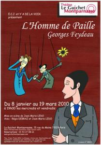 Cette adaptation de la pièce de Feydeau, L'Homme de paille, par Jean-Marie Ledo se joue, le rideau noir tiré, sur la scène du très sympathique théâtre de la rue du Maine au Guichet-Montparnasse. Que dire de l'accueil de Ghislain, un sourire éclairé de générosité et chaud comme une crêpe dorée saupoudrée de sa passion partagée et animée pour le théâtre. Prenez place et laissez-vous bercer par le texte emprunt à la gente bourgeoise du grand Paris, le Paris de la fin du XIXe siècle.La pièce débute, les gens ont instinctivement éteint leur portable, les mains calées sur les manteaux repliés, l'il aux aguets, l'oreille toute ouïe. Deux jeunes hommes endimanchés, l'un portant un bouquet de fleurs... parfum fraicheur fanée, les pétales frôlant l'irrévérence, l'autre l'allure nerveuse des grands jours farfouille les poches de son gilet où teintent bric et broc. Je te toise, tu me toises, je te regarde de biais, tu me regardes de travers, je te souris laconiquement, tu me souris hypocritement, je te tourne le dos, tu me tournes la tête. Histoires sans paroles, une musique comble le silence. La lumière s'éteint et s'allume sur la scène, le rideau tiré par Farlane.La scène offre la vue sur un intérieur d'appartement couleur catin, la locataire y voit la vie la rose et en plumes. Une nuisette toute de soie rouge partage le porte-manteau avec un boa vieilli par les usages du temps. Farlane s'est fait introduire par le concierge dans les étages. Un doute l'habite à peine le seuil de l'appartement franchi. Regards mêlés d'un sentiment de curiosité et d'incompréhension, il s'affaisse posément sur un fauteuil. Le décor et le mobilier ne sied pas à l'ambition politique de la citoyenne Marie. Enfin, attendons sagement qu'elle montre le bout de son nez. En attendant la visite chez le coiffeur, il n'a pas eu de nez à s'y rendre car la note pas maquillée sent la poudre à plein... nez.Arrive Salmèque, surpris à l'instar du précédent visiteur de ne point voir Marie. D'y trouver un autre personnage, homme ou femme, femme ou homme, est là toute la question. Si cet homme était Marie, quelle femme de mauvais aloi. Les présentations faites, conversation sans tain nous tînmes, l'accent marseillais rend la politesse à l'accent belge, une fois. On fait ami-amie ou amie-ami. Tamis de quiproquos, je pense que tu es Marie, tu penses que je vais devenir ton mari. La Marie n'est pas bonne à marier, le mari n'est pas prêt de se donner à sa Marie, mon mari s'il vous plait."Mais, il ne comprend décidément rien, pour qui se prend-elle... celui-là." Je mets ma main sur la tienne, tu ne la repousses pas, je danse une valse avec toi, l'index détaché, tu danses avec moi, la main effleure mon épaule. Emphase d'amour à phraser un "je t'aime", et potron-minet de répondre sans esquive "tu m'aimes". Feydeau immisce l'homosexualité en des mots joliment tournés au théâtre. Inconsciemment ou sciemment, le débat est ouvert pour certains, tout vert pour d'autres.Farlane et Salmèque interprétés par Régis Debraz et Jean-Marie Ledo parodient à merveille la caricature de ces hommes en quête d'un avenir politique, quitte à s'assouvir incorrectement au côté d'une femme aimée pour la bonne cause et pas pour la chose. En politique, tous les moyens sont bons pour arriver à ses fins.Le texte se fond dans un maquillage verbal acerbe et désinvolte, les répliques se jouent des joutes soulignées d'emphase et d'ironie. Cela plait beaucoup, les gens s'esclaffent, les rires passent de banquettes en banquettes. La mise en scène de Jean-Marie Ledo est une réussite due à la pertinence d'un Feydeau à l'aube de sa reconnaissance. Ledo signe en Feydeau, un avenir prometteur sur la scène du théâtre français.Un salut, un bis et au revoir messieurs les comédiens. La bonne humeur s'évade jusque dans la rue où les gens, heureux d'avoir passé une bonne soirée, commentent la gaieté manifestée par L'Homme de paille. L'homme de paille n'est pas un épouvantail à moineaux. L'Homme de paille est une pièce généreuse où l'intelligence de la mise en scène se Marie avec la prestation parfaite des deux comédiens. Le théâtre Le Guichet-Montparnasse, une ruche riche d'une programmation à consommer sans modération.