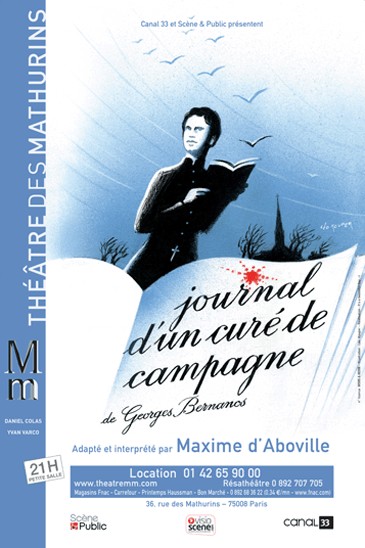 Le décor dépouillé, sobre, une table, un bougeoir allumé, un prie-dieu, un banc en bois sont les premiers constituants du cliché bernanosien pour que naisse au public son monument littéraire Le Journal d’un curé de campagne. Soudain nous apparait, jeune, fragile, élégamment vêtu de sa soutane simple sans ceinture romaine, le curé d’Ambricourt qui va nous livrer ses propres états d’âmes, sa difficulté à se faire aimer de ses paroissiens dans sa dure et triste campagne d’Artois.Maxime d’Aboville, dans ce rôle capital, transpire d’émotion. Son visage se crispe, montre toute son humanité dénuée de mysticisme ; accoutumant son éloquence à un fabuleux exercice de mémoire qu’on ne peut indéniablement pas dissocier de la foi chez lui qu’on devine. Habité par l’uvre de Bernanos, choisissant de la mettre en scène aussi bellement dans l’abstraction, Maxime d’Aboville remplit en quelque sorte, sa salle non plus de 84 sièges mais de 84 fidèles. L’il du critique s’intéressant autant au fond qu’à la forme, ne négligera pas d’observer moult gentes dames en jupes écossaises, une poignée de "maries-serres-têtes", un abbé en clergyman, quelques jeunes hommes aux coupes de cheveux fraiches à la scout pour vivre ce sermon sur la dureté sacerdotale.Le talent de ce jeune comédien restaure là une uvre servant une langue française d’exception, sans raison valable, boudée par la scène. Les causes de cette absence sont bien sûr relatives à la thématique catholique à destination d’un certain public, mais aussi à Bernanos lui-même en tant qu’auteur engagé tant dans le catholicisme autant qu’en politique, si l’on n’occulte pas son militantisme pour l’action française.Ces vieux démons qui font de Bernanos le nationaliste monarchiste, l’auteur scandaleux pour certains, font aussi de lui un homme d’audace et de bravoure, lui qui fut aussi, et il ne faut pas l’oublier, un inspirateur de la résistance. Rien de surprenant donc à ce qu’un Maxime d’Aboville se lance le défi de cette adaptation comme un écho à son oncle le navigateur aventurier bien connu : Gérard d’Aboville.C’est une aventure de monter seul sur scène pour incarner les traits d’un prêtre qui souffre jusqu’à l’agonie, amenée par le lent chemin de la maladie jusqu’au caillot de sang expectoré que Bernanos trouve le moyen de poétiser dramatiquement dans la bouche du protagoniste. Une aventure certes, mais une aventure iconoclaste, une sorte de défi venant prouver que la scène peut être aussi le lieu du dépassement de soi pour se laisser sculpter, façonner, éroder par l’invisible dans l’intériorité. Savoir ce dévêtir de sa propre image et embrasser celle de la souffrance du curé d’Ambricourt comme pour goûter son propre moi jusque dans ces confins, c’est l’ouvrage ambitieux de ce jeune comédien.L’émotion, la souffrance, les petits instants de joie sont autant de minuscules parcelles que le visage du comédien, transporté par la grâce, diffuse à son public. Irait-on jusqu’à dire qu’on perçoit dans les yeux de Maxime d’Aboville, habité par son personnage, une forme d’illuminisme semblable à celui de Thérèse de l’Enfant Jésus. L’hommage à Bernanos serait à son paroxysme car nul n’ignore que le roman se ponctue de cette belle citation thérésienne : "Tout est grâce".De la clarté bernanosienne pour ne pas dire de son soleil noir, il reste, en plus du regard du comédien qui nous a fait voyager, une ultime lumière, celle d’une simple bougie qui éclaire les pénultièmes lignes lues par le narrateur lui-même, portant la soutane passée de son héros comme une dernière photographie de ce monument littéraire aujourd’hui admirablement scénographié.