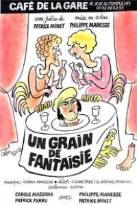 Coluche et Romain Bouteille furent les papas de la maison, Le Café de la Gare. Dans cette maison, c'est une grande famille, celle du café-théâtre, qui y réunit en son temps les apprentis comédiens d'hier, le talent sans égal d'aujourd'hui médiatisé des Miou-Miou, Gérard Depardieu, Renaud, Eric et Ramzy, Benoit Plvoorde ; famille également orpheline de la disparition prématurée de Patrick Dewaere. Un grand comédien, il fut, un talent incomparable, il reste aujourd'hui et demain encore... Souvenirs, souvenirs, album photos et kleenex mouillés des rires, souillés des pleurs. Où est passé le temps des pièces déjantées, celles où les gens riaient sans complexe ?Eh bien, faites la queue, prenez votre ticket à la caisse, là juste à droite et rentrez dans cette salle aux banquettes rouges, à lèvres pulpeuses, et laissez-vous aller... jusqu'au bout de la comédie Un Grain de fantaisie.Le spectre de tonton décédé apparait la queue-de-pie faisant la roue au haut de forme, pour un mort, il a haut la forme. Pfioutt ! Comme par magie, en boîte le tonton, disparu. Deux vieilles surs attablées et occupées à équeuter les haricots verts avec des fils, attendent l'arrivée du facteur. Il en a une tête celui-là, bon à marier avec une vieille fille, un thon. Edith et Léone, interprétées par Philippe Manesse et Patrice Minet, sont attifées de robes, pas des chasubles, mais avec un goût à faire rebrousser chemin aux détraqués sexuels. A défaut de se faire rebrousser les jupons, elles continuent à commenter la mort du tonton, l'héritage, quel en sera la teneur ? Dans les lettres déposées par le facteur, l'une annonce qu'héritage partagera, quand l'une des deux surs se mariera. Sans compter sur le cousin Félix, incarné par Patrick Farru, qui arrive à l'improviste chez ses cousines, accompagnée d'une promise Sylvie jouée par Carole Massana.Le décor, un appartement de petites gens puant la fourberie et le commérage, l'avare hisse au fond du tiroir, le mobilier du plaqué déco peint au petit pinceau et à l'eau, une télé pas plasma, un écran plastodonte.