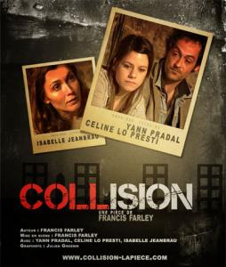 Collision, une nouvelle création théâtrale présentée au théâtre de l'Essaion, écrite par Francis Farley. L'auteur de la pièce aurait pu être instigateur de l'émission culte La Tête et les Jambes. Francis Farley voue sa vie à sa famille, d'ailleurs Collision est une affaire de famille au sens noble et large du terme, au sport et s'adonne à l'écriture méticuleuse de plusieurs volumes sur l'histoire de la Guerre de cent ans. Sa plume ne demeure pas en reste ; n'écrit-il pas des romans qui lui vaudront la reconnaissance de ses pairs et la distinction par la remise de plusieurs prix littéraires.Francis Farley, la discrêtion l'habille élégamment à l'instar de sa plume qui fait couler l'encre pour calligraphier une jolie prose sur la page blanche... côté scène. Rideau.Une jeune fille assise dans un coin, les yeux sombres regardent le flou et l'incompréhension de la cellule où elle a été conduite par les keufs hier soir. Ses cheveux, coiffés de la veille, masquent un visage las de cette garde-à-vue inattendue.