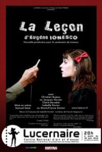 La leçon de Ionesco, pièce datant de 1950 sur les thématique du pouvoir et de l’enseignement, est réputée pour être une création emblématique du courant de l’absurde au XXe siècle. Quid de sa reprise par Samuel Sené au XXIe ?Plusieurs procédés scéniques témoignent d’abord effectivement de la dimension comique de cette pièce : jeux de mots et gestes sans lien avec les propos qu’ils illustrent prêtent largement au rire. Néanmoins, la mise en scène de Samuel Sené remplit le bocal formellement absurde de cette pièce d'un contenu qui pousse à la réflexion. Ce spectacle présente en effet un questionnement sur l’assèchement du sensible auquel conduit le savoir trop poussé, un avertissement sur la relation de pouvoir intrinsèquement violente professeur/élève ou encore une interrogation sur la frontière floue entre folie et intelligence culminante.Le décor est simple mais ingénieux, l’usage des lumières mesuré, la bande sonore brève et puissante. Ces procédés formels permettent aux personnages d’affirmer leurs singularités en toute sobriété. Et quels personnages !...Marie-France Santon, la bonne, semble être l’incarnation du tragique de la pièce. Elle scrute la jeune élève sinistrement ; elle profère au professeur des avertissements qui résonnent comme ceux d’un coryphée de tragédie. Discrète mais efficace, son visage froid participe d’accroître le malaise chez le spectateur en mettant le doigt sur la violence symbolique et physique se jouant entre les deux protagonistes principaux.Claire Baradat interprète une bachelière bêtasse et souriante jusqu’au nud de cheveux rouge avec brio. Sa voix sur-aiguë et ses ridicules mimiques esthétisantes la gorgent, dans un premier temps, de cette imbécilité que le rôle réclame pour fonctionner. Mais, dans un second temps, ses geignements (dus à son "mal au dents" pendant un "cours de langue") évitent l’écueil du sur-jeu bêtifiant : bien que le personnage reste agaçant parce que profondément idiot, on se surprend à avoir réellement pitié de lui et à souhaiter que le professeur fasse droit de son statut d’individu au lieu de se cantonner à l’objectiver.Jacques Verzier incarne avec finesse un professeur tyrannique, raisonnant jusqu’à l’inhumanité. D’abord drôle involontairement, bouillonnant de connaissances et de charisme, il se montre rapidement sans pitié et aveuglément violent. Parfaite illustration de la sècheresse d’humanité que réclame l’abandon total d’un homme dans la science, il met l’emphase sur une problématique qui, si elle était déjà alarmante en 1950, l’est d’autant plus actuellement. Mais Jacques Verzier (est-ce son âge et son crâne chauve qui veulent ça ?) ne se limite pas à transpirer la cruauté : au personnage psychiquement atteint du texte Ionesquien, l’acteur ajoute une tension sexuelle subtilement suggérée. A plusieurs reprises, la satyre de l’éducation quitte l’intellectualité pure pour se nicher dans une ambiguïté physique.Cette reprise de Ionesco au Lucernaire est donc une réussite : sobre mais éloquente, elle témoigne du point auquel les procédés absurdes sont liés au tragiques et combien, dès lors, ils nous alertent largement sur (sous couvert de nous faire rire de) notre humaine condition.