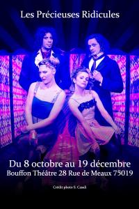 Ça y est ! Enfin ! En 1659, depuis maintenant un an, Molière, âgé de 38 ans, a obtenu le succès tant espéré ! Le voilà protégé du roi Louis XIV en personne qui, chose exceptionnelle, lui a octroyé une salle (on était alors loin des plus de deux cents salles de spectacles que Paris propose actuellement). Les choses ont bien changé depuis son exil provincial : la période de gloire de celui qui sera considéré comme l’emblème du théâtre français a débuté.La spécialité de Molière reste encore la farce (même si la satire sociale est déjà bien présente). Dans l’interprétation comique, il a un rival : Jodelet. Toutefois, avec l’aura qui est désormais la sienne, Molière réussira à faire intégrer ce dernier dans sa propre troupe. Leur seul fait de gloire commun sera Les Précieuses Ridicules (Jodelet mourra quelques mois après) dans lesquels le duo comique de l’époque interprètera les deux valets des amants passablement énervés d’avoir été éconduits par Magdelon et Cathos. Sur la demande de leurs maîtres, ils apparaîtront déguisés : en marquis de Mascarille (rôle tenu par Molière), et en Vicomte de Jodelet (qui sur scène, vu sa célébrité, gardera son nom). Le show peut commencer !Le metteur en scène Richard Arselin n’a pas lésiné sur les moyens pour remettre le ridicule de l’âge classique au goût du jour. L’univers évoqué ici est volontairement ringard (le tout se joue sur de la musique disco) pour célébrer cette pièce dans la pièce où les deux précieuses jouent les vedettes à leur insu... Ils sont quatre (Marie de Oliveira, Mathilde Levesque, Franck Etenna et Luca Lomazzi) pour jouer les neuf personnages de la farce, or, grâce à leur savoir faire, la pénurie d’acteurs se transforme en superbe source d’inventivité.On joue, on chante, on danse, on se déguise, dans une ambiance parfois un peu trop criarde (la salle est petite...), mais où les complexes n’ont pas dépassé le seuil de la porte du théâtre. Le kitsch se dévoile au beau jour et son aspect volontairement ostentatoire n’est pas juste une coquetterie de mise en scène : il sert à souligner d’autant plus cruellement l’aveuglement des précieuses.Les Précieuses Ridicules au Bouffon Théâtre, ou de l’art de dépoussiérer les classiques !