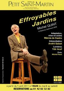 Le roman de Michel Quint est un récit de vie, le souffle coupé d'un adolescent en désaccord avec les pitreries de son père. Un texte profond écrit avec des mots simples et empreint de sensibilité. Une parenthèse s'ouvre sur un fait divers de la Seconde Guerre mondiale. Entre deux virgules, l'humour côtoie la peur, le rire aux larmes. La résistance s'organise, les sentiments font le siège.Effroyables Jardins, à sa parution en 2000, connut un succès immédiat, plébiscité par l'intérêt manifesté des lecteurs et approuvé par la critique littéraire. Ce texte a été adapté au cinéma par Jean Becker en 2003 et interprété entre autres par Jacques Villeret, André Dussollier et Suzanne Flon.Cette fois, la scène du théâtre du Petit Saint-Martin se prête volontiers à cette pièce mise en scène par Marcia de Castro. Ce texte résonne comme un écho dans la mémoire de cette femme d'origine brésilienne. Elle a vécu, dans sa jeunesse, la dictature et les interdits en tous genres imposés par l'autorité militaire.L'adaptation de cette pièce s'articule autour du jeu d'un comédien, André Salzet. Un rôle planté avec profondeur dans cet Effroyables Jardins. Un banc en bois trône au milieu de l'espace plongé dans une semi-pénombre.Ce court récit de Michel Quint raconte l'histoire de Lucien. Son père portait la blouse grise d'instituteur et l'accoutrement de clown à ses heures libérées. Le jeune garçon n'éprouvait aucune émotion pour les clowns. "Plus que tout au monde, j'ai détesté les augustes. Plus que l'huile de foie de morue, les bises aux vieilles parentes moustachues et le calcul mental, plus que n'importe quelle torture de l'enfance."Son père se produisait ici et ailleurs sous le costume d'auguste-amateur pour rien, juste pour le bonheur des autres. Les petits moments en famille, il n'y en avait pas. Lucien en arrivait à mépriser ce père délaissant régulièrement les siens. Un jour, le cousin Gaston décide de dévoiler à Lucien l'origine du nez rouge. Il raconte