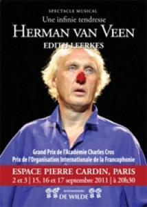 La nouvelle tournée mondiale d' Herman van Veen démarre en fanfare à Paris ! En effet, l'artiste hollandais fête ses 45 ans de scène, en décorant l'Espace Cardin des roses baptisées de son nom. Poète, clown et musicien, il fait mouche et le public adore !Il entre sur scène vêtu de noir. Avec ses cheveux d'un blanc lumineux et son sourire facétieux, Herman van Veen surprend par ses multiples facettes : il joue du violon, chante, écrit, compose, est acteur, metteur en scène, peintre et activiste pour la défense des droits de l’enfant.Depuis un demi-siècle, ce troubadour des temps modernes déambule de par le monde avec ses spectacles très personnels. Jouant d’Amsterdam à Tokyo, dans les salles les plus prestigieuses aux plus petites, dans les cafés, dans les églises, sur les grand-places, il a obtenu de nombreuses distinctions dont le Grand Prix de l'Académie Charles-Cros et le Prix de l'Organisation internationale de la francophonie.Le rideau s'ouvre sur un splendide piano entouré de trois guitares et d'une contrebasse. Herman van Veen chante d'une voix douce en français, anglais, allemand, néerlandais, accompagné d'une guitariste virtuose, Edith Leerkes. A un moment, il ouvre une petite porte sur la contrebasse pour en sortir un violon dont il se sert avec une maestria étonnante ! S'ensuivent des ballades amoureuses, des textes plein d'humour et de tendresse, alternés par des séquences parodiques interprétées par Herman van Veen. Celle des chanteurs d'opéra est très réussie !Là, toute sa virtuosité d'acteur, de mime et de clown prend son sens. Il utilise son corps, ses mains pour créer des instruments (flûte de pan), jongle avec des harmonicas tout en gardant un esprit facétieux ! Il inonde la scène de musiques, de balles de ping-pong, de poussières étoilées et fait participer le public à sa mise en scène. Drôle, poétique et interactif, le spectacle plaira autant aux jeunes qu'aux grands ! A ne pas rater !