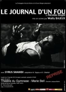 mentaux, fait uvre de précurseur, tant sur le plan littéraire que médical.Il est certain que le jeu sur scène de Syrus Shahidi aurait fait changer d’avis Prosper Mérimée, frileux jusqu'à condamner Gogol d’utiliser la folie comme un moyen de propagande parlant même de "trivialités". Le jeune comédien est tout sauf trivial et la physionomie de circonstance qu’il adopte touche aux points sensibles de notre inconscient.Poursuivant à nous hypnotiser et à nous captiver, on prévoit un peu que l’acteur va se dépoitrailler, le torse nu étant devenu une sorte de figure obligée du théâtre actuel. Quoi qu’il en soit, l’image est juste et l’esthétique de la douleur qui bande les muscles est une délectation pour les yeux quand un corps est si bellement sculpté. Bientôt, la semi-nudité du malheureux ne quitte plus notre regard époustouflé de la violence avec laquelle il s’inflige lui-même les coups qu il reçoit à l’asile en guise de traitement.Puis, transi de froid, le comédien se blottit soudain en chien de fusil, en arrière plan de la scène, et les mots qui viennent s’ajouter à ses frissons plaquent l’accord final : "une corne résonne dans le brouillard... Est-ce ma maison, cette tache bleue au loin ?... Est-ce ma mère, assise devant la fenêtre ?... Maman ! Sauve ton pauvre fils ! Laisse tomber une petite larme sur sa tête endolorie...".