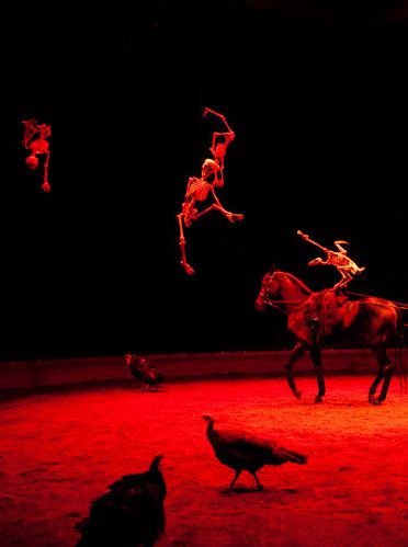 Bartabas est maintenant un habitué des Nuits de Fourvière. Il y revient cette année avec sa dernière création : Calacas ("squelettes"). Le principe de base reste le même que dans tous ses spectacles : il nous convie à un grand théâtre équestre, réunissant chevaux, écuyers, acrobates, danseurs et musiciens. Mais la thématique est toute nouvelle : c’est le folklore mexicain qui est à l’honneur, et plus précisément la fête des morts. Bartabas met en scène la joie dont font preuve les Aztèques face à la mort. Son show équestre est ainsi un étonnant mélange de macabre et de bouffonnerie. On se croirait chez Tim Burton !Les squelettes volent dans les airs, enfourchent les chevaux, rient à gorge déployée. Les musiciens interprètent des mélodies gaies et entraînantes. Les danseurs et acrobates s’en donnent à cur joie également, à l’aise sur le dos de leurs montures comme s’ils étaient sur la terre ferme. Ensemble, ils produisent un magnifique ballet multicolore. La mise en scène, très colorée donc, joue d’ailleurs beaucoup sur les changements d’ambiances : des variations de lumière accompagnent celles de la musique, de nombreux effets visuels sont créés, à commencer par la mise en place d’une sorte de pochoir géant entourant les gradins, dont les petits trous dessinent des têtes de mort ! Les personnages de carton ou de caoutchouc, squelettes pour la plupart, qui défilent sous nos yeux, sont eux-mêmes toujours mis en valeur par un éclairage particulier, passant du rouge au bleu, de la lumière éclatante à la pénombre intimiste. Chaque tableau renouvelle notre émerveillement. La scénographie est vraiment somptueuse du début à la fin.Mais elle ne se raconte pas. Il faut se rendre sous le chapiteau du parc de Parilly pour comprendre dans quelle atmosphère nous plonge ce spectacle euphorisant. Il faut s’y laisser aller, se laisser gagner par une émotion simple, laisser ses yeux s’éblouir et ne pas chercher plus loin.