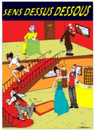 Le Complexe du rire, un nom qui rappelle le titre d’un roman de Philip Roth. Deux comédiens en ont fait un café-théâtre. Un lieu qui comporte deux salles de spectacles et un bar à tapas où se retrouvent les noctambules. Depuis qu’ils l’ont investi, les propriétaires projettent de jouer une pièce qui se déroulerait sur les deux étages. Ce concept innovant a donné naissance à Sens dessus-dessous.L’intrigue se déroule dans un hôtel. La même histoire est jouée en deux versions presque simultanées : une fois vue de la salle du bas, qui fait office de réception et une autre fois vue de la salle du haut, où est planté le décor de la chambre d’une cliente un peu particulière. Les six personnages font l’aller-retour entre les deux étages pour faire vivre ces deux points de vue. Au spectateur de choisir dans quel sens il regarde ce spectacle, sachant qu’il peut découvrir en haut une galerie de portraits et assister en bas à un duo comique plutôt bien réussi.Pour donner vie à ce spectacle burlesque qui flirte au début avec le boulevard et par moments avec l’absurde, il faut un remarquable travail de mise en scène, de coordination et nécessairement d’improvisation dû au temps de trajet entre les deux étages. Bien qu’ils s’amusent à jongler entre les deux plateaux, les comédiens rament un peu pour conserver le caractère de leur personnage et ont tendance à crier pour se faire entendre du bas. Néanmoins, ils déclenchent les rires surtout lorsque tout dérape et que plus rien n’a de sens, ni dessus, ni dessous.