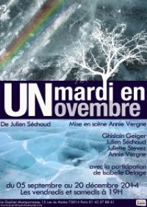 Julien Séchaud, la fine plume du Guichet-Montparnasse. Après Aimez-vous la nuit, Un mardi en novembre ouvre la saison 2014-2015 de ce théâtre situé à quelques pas de la Gare Montparnasse. L'auteur de la pièce est un ébéniste de la langue française, il connaît la matière des mots, il les sculpte dans le sens de l'histoire et les dispose les uns à côté des autres avec le savoir-faire de l'artisan passionné. De ses histoires naissent des émotions, des expériences vécues, des moments de vie partagée, des solitudes semées de silence, des joies déliées sur le fil de la tendresse et de l'humilité.