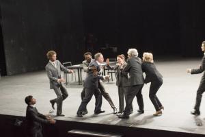 L’esthétique est bel et bien soignée mais elle n’empêche qu’on assiste à des comportements primaires, presque animaux des membres de l’assemblée. Les avis divergent, se contredisent, des conflits sont ouverts, les paroles sont souvent coupées, contestées, entravées. Les corps s’agitent, s’agressent, les comédiens sont plein d’énergie et de vitalité passionnée et emportée. Nous n’avons pas été témoin de cette réalité politique mais le parallèle avec le comportement des hommes politiques aujourd’hui est à interroger. La pertinence de mettre en scène un tel débat au théâtre est fort de sens, non seulement, de part l’origine de sa naissance mais également parce que la question suivante est soulevée : les politiciens ne sont-ils pas avant tout de très bons comédiens ? Mais…oui, ça ira !