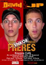 Ils sont ENKOR frères, ils sont ENKOR bretons et ils sont ENKOR plus cons ! David et JP, un duo détonnant à découvrir d'urgence tant qu'ils sont ENKOR en liberté. David et JP reviennent au Koçona Café avec une nouvelle version remixée de leur spectacle Peut mieux frères ! qui avait connu un vif succès au premier semestre 2004 dans cette salle. Toujours prêts à dealer de la blague à deux balles, ces deux gangsters de l'humour sont armés jusqu'aux dents pour vous faire rire ! Au menu de la transaction de sketches : l'incontournable GPS, la leçon de drague, une nouvelle soirée Speed-dating, un JT pas là ! tout neuf, une Brigade anti-comiques ENKOR plus remontée et plein de nouveaux sketches inédits avec plein des blagues dedans, et promis, c'est de la bonne ! David et JP, un duo détonnant à découvrir d'urgence tant qu'ils sont ENKOR en liberté.