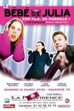 Etat d’urgence chez Julia, le soir où son bébé se transforme en adulte tout en conservant les réflexes et l'esprit de l'enfant de 3 trois ans qu'il était. La nouvelle comédie de l’auteur metteur en scène à succès Patrick Hernandez (Le Grand Amour, Les Colocs : coming out, Mars et vénus mis en pièce(s)). Le Bébé de Julia, c’est une comédie grand public, une écriture efficace, des comédiens à l’énergie décapante... Avec notamment Bérengère Bottero (Salade de Nuit aux Blancs-Manteaux).
