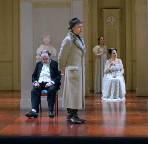 Du Malheur d’avoir de l’esprit est l’unique pièce de Griboïedov. Ecrite en 1824, elle fut interdite dès 1825 pour ses attaques contre la cour et les courtisans de Moscou. En effet, Tchatski, le héros, est un jeune écrivain rebelle qui, de retour de voyage, fait son entrée à Moscou plein d’idées de réforme. Il dénonce librement l’hypocrisie et la vanité des courtisans, prêts à tout pour assurer leur ascension sociale et obtenir des honneurs. Le thème est universel toujours les hommes ont brigué et brigueront des titres, une position sociale, la fortune ou encore la célébrité ; mais on comprend combien il a pu être provocateur dans le contexte dans lequel son auteur l’écrivit. A cette critique de la société s’ajoute une histoire d’amour : Tchatski est épris de Sofia, la fille de Famoussov, un notable riche et corrompu. Cependant, plusieurs obstacles vont se trouver sur sa route : le père de la belle veut la marier au colonel Skalozoub, un militaire riche et stupide ; et la belle, elle-même, s’est détournée de Tchatski, son amour d’enfance, pour offrir son cur à Moltchaline, le fade et hypocrite secrétaire de son père. L’intrigue est prometteuse.Malheureusement, une fois cette situation initiale exposée, les choses ne vont pas beaucoup évoluer. Pas de rebondissements, de péripéties ou autres retournements de situation théâtraux. Place à la linéarité, au ressassement et, il faut l’avouer, à l’ennui. Les quatre actes ne sont qu’une succession d’épisodes mondains au sein desquels Tchatski le cynique, Tchatski l’idéaliste révolté, Tchatski l’amoureux éconduit va déverser son fiel. Certes ses répliques sont intéressantes, parfois même piquantes, mais leur message reste le même tout au long de la représentation. On se lasse. Pourtant, Torreton est parfait ; les vers sortent naturellement de sa bouche ; sa présence est imposante, charismatique. Rien à redire. Ses compagnons de jeu, en revanche, moins à l’aise, ne nous convainquent pas totalement. Leur prestation, plus empesée certes, c’est peut-être le moyen de figurer une société mondaine artificielle , n’emporte pas notre adhésion et nous laisse froids.Quant à la mise en scène la première de la pièce en France , que lui reprocher ? Le décor et les lumières sont classiques mais impeccables, les costumes d’époque parfaits, la scénographie sobre et juste. Alors, me direz-vous, pourquoi cet ennui irrépressible ? La faute au texte ? Oui, certainement. Sans doute manque-t-il quelques rebondissements afin de dynamiser l’ensemble. Deux heures trente de mondanités commentées et dénoncées par un homme, quand bien même il est incarné par Torreton, c’est assurément trop long.